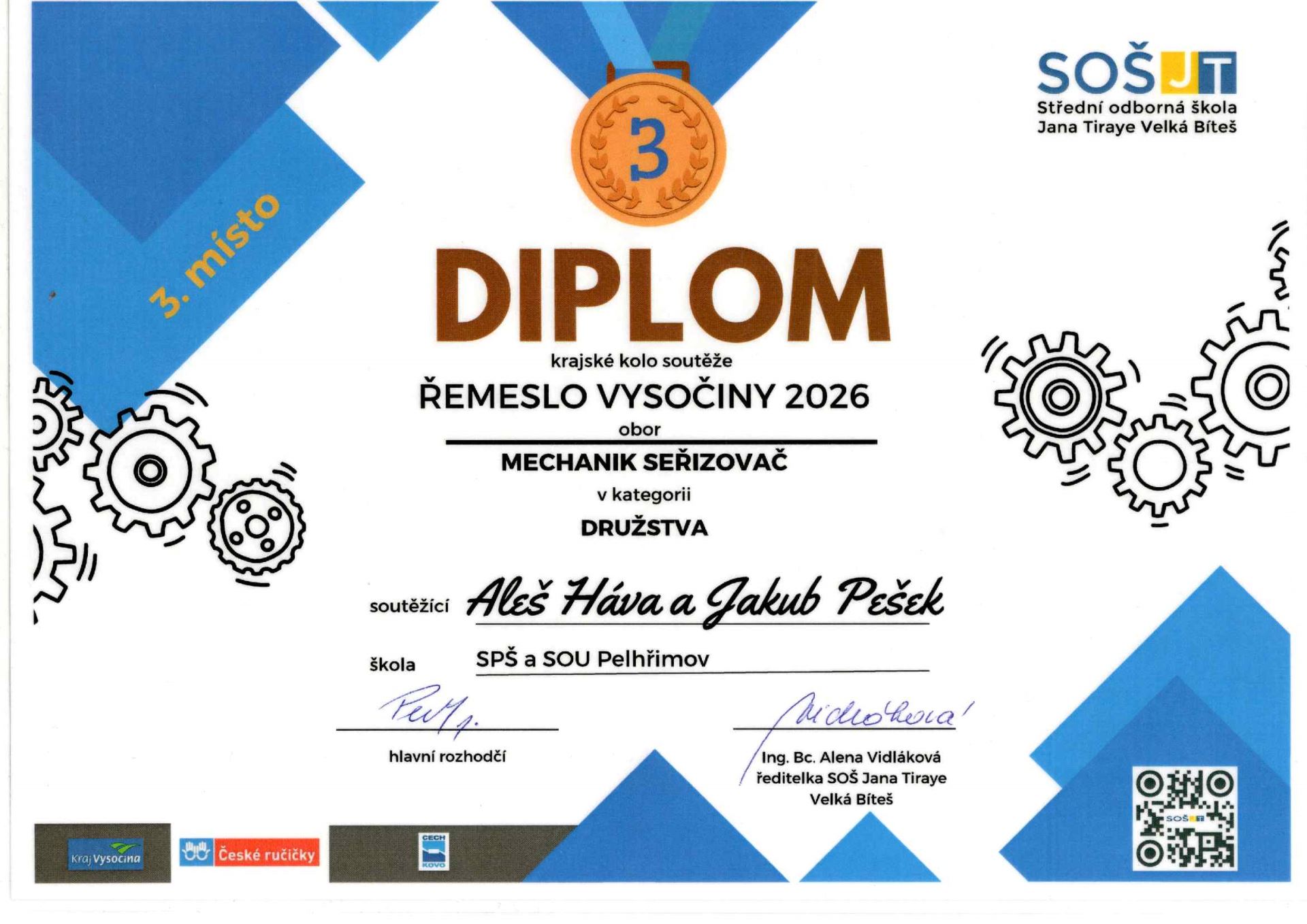 Naši žáci 2. a 4. ročníku oboru Mechanik seřizovač Aleš Háva a Jakub Pešek se zúčastnili dne 12. 2. 2026 krajského kola soutěže „ŘEMESLO VYSOČINY 2026“- KOVO JUNIOR 2026 ve Velké Bíteši. Ve družstvech se umístili na 3. místě, v jednotlivcích Jakub obsadil 6. a Aleš 10. místo. Blahopřejeme